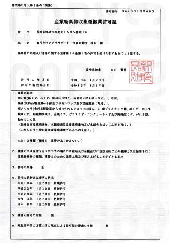 | 産業廃棄物許可 | 収集運搬業 長崎県04200109400 処分業 長崎県04200109400 |